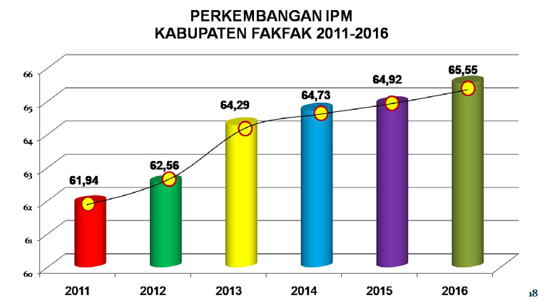 Berdasarkan data IPM terbaru sesuai data BPS Kabupaten Fakfak Tahun 2016, IPM Kabupaten Fakfak bergerak naik dan mengalami perkembangan mencapai 65,5 point.
