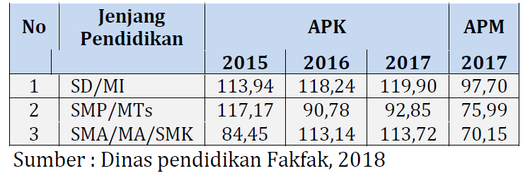 Berdasarkan data dari BPS Fakfak Tahun 2017, APM untuk SD/MI : 97,70 %, SLTP/MTs : 75,99 %, SLTA/MA : 70,15 %. Tampak bahwa angka partisipasi untuk tingkat sekolah dasar lebih tinggi dibandingkan dengan tingkat SMP dan SMA. Ini menunjukkan bahwa masih banyak penduduk usia sekolah SMP maupun SMA di Kabupaten Fakfak yang belum bersekolah.