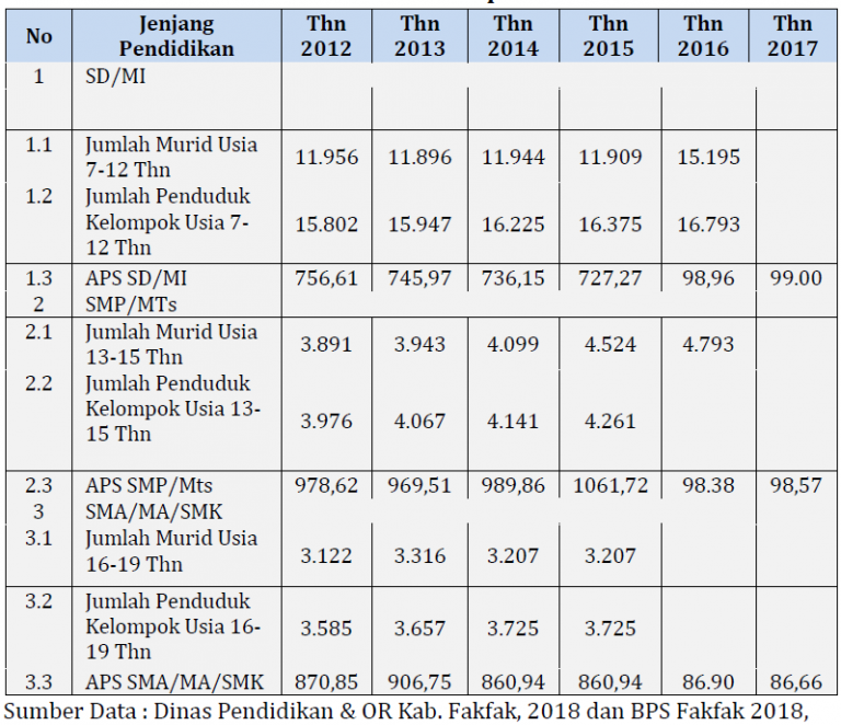 Angka Partisipasi Sekolah (APS) Tahun 2012-2017 Kabupaten Fakfak